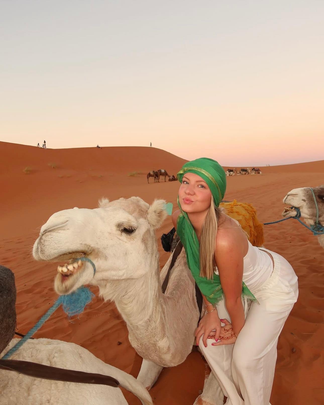 Your Fes to Marrakech Desert Tour 3 Days begins early in the morning with a pickup from your hotel or riad in Fes. As you leave the city behind, the scenery transforms into the breathtaking landscapes of the Middle Atlas Mountains. The road climbs gently toward Ifrane, a charming alpine-style town often compared to Switzerland for its clean streets, cool climate, and European-inspired architecture. After a short visit, the journey continues to the Cedar Forest of Azrou, where the famous Barbary macaque monkeys live freely among ancient cedar trees. It’s a peaceful place to stretch your legs, enjoy fresh air, and observe the wildlife before continuing south From Azrou, the road leads through Midelt and the mountainous passes toward the vast Ziz Valley, famous for its endless palm groves and dramatic rock formations. The deeper you travel into this region, the closer you get to the edge of the Sahara Desert. By the afternoon, you arrive in Merzouga, the gateway to the impressive Erg Chebbi dunes. Here, your camels will be waiting to take you on a beautiful camel trek across the golden dunes. As you ride toward your camp, the desert becomes filled with warm colors as the sun slowly sets, creating one of the most memorable moments of the tour At your desert camp whether luxury or standard you will be welcomed with traditional Moroccan mint tea and guided to your comfortable private tent. Dinner is served under the stars, followed by Berber drumming and music around the fire. The silence of the night, the clear sky, and the glowing dunes create an unforgettable atmosphere before you rest in the heart of the Sahara night under the starry sky in luxury tents with private bathrooms.